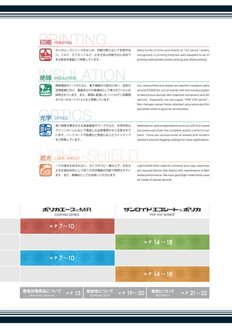 P7~10P7~10P14~18P14~18ポリカエースシリーズをはじめ、印刷分野において定評があり、シルク・オフセットなど、さまざまな印刷方式に対応できる素材を豊富にご用意しています。Manykindsoffilmsandsheetsof“ECseries”widelyrecognizedinprintingfieldarewelladaptedtoallofprintingmethodslikescreenprintingandoffsetprinting.PRINTING印刷携帯電話やノートPCなど、電子機器の小型化に伴い、従来の空間絶縁に代り、基盤まわりの絶縁材として様々なフィルムが採用されています。また、環境に配慮したノンハロゲン系難燃ポリカーボネートフィルムもご用意しています。OurvariousfilmsandsheetsareusedforinsulationpartsaroundPCB(Printcircuitboard)withtheminiaturizationofelectronicsdeviceslikenotebookcomputersandAVdevices.Especially,wecansupply“PHF,VHFseries”,Non-halogenseriesflameretardantpolycarbonatefilmandsheetwhichisgoodforenvironment.INSULATION絶縁高い精度が要求される液晶面板やゴーグルなど、光学材料はクリーンルームにおいて徹底した品質管理のもと生産されています。ハードコートや防曇など用途に応じたラインアップをご用意しています。MaterialsforopticalapplicationssuchasLCDfrontpanelareproducedunderthecompletequalitycontrolinourplant.Therearevariouskindsofsheetswithscratchresistantandanti-foggingcoatingsformanyapplications.OPTICS光学一寸の感光も許されない、カメラやコピー機などで、光をさえぎる遮光材料として多くの光学機器の内部で使用されています。また、絶縁材としてもお使いいただけます。Lightshieldfilmsusedforcamerasandcopymachinesarerequiredthinnerthanbeforewithmaintenanceoflightshieldperformance.Wehavegoodlightshieldfilmsusedforinsideofopticaldevices.LIGHT-SHIELD遮光LIGHT-SHIELDP13環境対策商品についてAboutEcoproductsP19~20燃焼性についてBURNINGTESTP21~22物性についてPROPERTYCOATINGSERIES“PHF,VHFSERIES”