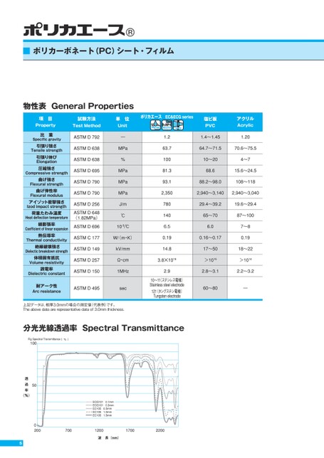 5■ポリカーボネート(PC)シート・フィルム物性表GeneralProperties6.5上記データは、板厚3.0mmの場合の測定値(代表例)です。Theabovedataarerepresentativedataof3.0mmthickness.分光光線透過率SpectralTransmittance
