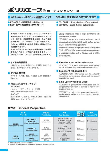 7■ポリカーボネート(PC)シート耐擦傷コートタイプSCRATCHRESISTANTCOATINGSERIES■●すぐれた耐擦傷性一般ポリカーボネート板に比べ、表面硬度を向上させておリ、傷がつきにくくなっています。●すぐれた加工性ポリカエース同様、裁断、打ち抜きなどの機械加工が可能です。●用途に応じたラインナップ[EC100R2]ヘルメットバイザー、スキーゴーグル等熱曲げやR曲げが可能な一般グレード。[ECF100V]液晶保護カバー、銘板等、外観基準の厳しい用途に使用可能なハイスペックグレード。●Excellentscratchresistance"EC100R2","ECF100V"serieshavebettersurfacescratchresistancethangeneralpolycarbonatesheet.●Excellentfablicatability"EC100R2","ECF100V"serieshavefablicatabilitylikecutting,punching,andotherssuchasgeneralpolycarbonatesheet.●Line-upforvarioususes"EC100R2"isgeneralhardcoatedgrade,andcanbeappliedtothermoform,tobeusedashelmetvisor,gogglesandsoon."ECF100V"ishighqualitygrade,andmeetsstrictrequirementofsurfacespecificationssuchascoverpanelofLCD.●EC100R2表面硬度板(一般グレード)●ECF100V:表面硬度板(光学用グレード)ポリカエースコーティングシリーズは、ポリカエース表面を処理することで、様々な機能を付与したシリーズです。表面硬度板ポリカエースMRは表面が傷つきにくいコーティングをした製品です。このため、長期間美しい外観を保ち、幅広い分野への展開が可能です。さらに光学分野の中でも外観基準の厳しい液晶面板等のハイスペック用途へ展開出来るグレード(商品名:ファインライト)も取り揃えております。Coatingserieshaveavarietyofuniqueperformanceswithspecialsurfacetreatment."EC100R2"seriesarescratchresistantcoatedpolycarbonatesheetshavinghighqualitysurfaceandcanbeusedforthermo-formingapplications.Furthermore,wecanarrangespecialhighqualitygrade“FINELITE”ECF100VseriestomeetsevererequirementofsurfacespecificationssuchasthecoverpanelofLCDinopticalindustries.●EC100R2:ScratchResistant(GeneralGrade)●ECF100V:ScratchResistant(OpticalGrade)物性表GeneralPropertiesECF100V耐擦傷性Abrasionresistanceコーティングシリーズ