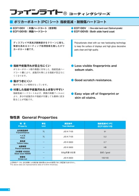 9■ポリカーボネート(PC)シート指紋低減・耐擦傷ハードコート●指紋や皮脂汚れが目立ちにくいポリカーボネート板の表面に付与した、指紋低減ハードコート層により、皮脂汚れ等による指紋が目立ちにくくなります。●傷がつきにくい傷が付きにくい特性をもっています。●付着した指紋や皮脂汚れをふき取りやすい指紋低減ハードコートおよび、表面の保護フィルムにより、多少の皮脂汚れや指紋が付着しても簡単に拭き取ることが可能です。●Lessvisiblefingerprintsandsebumstain.●Goodscratchresistance.●Easywipeoffoffingerprintorskinoilstains.●ECF100V:片面ハードコート(光学用)●ECF100VB:両面ハードコートディスプレイや高光沢装飾部分をクリーンに保ち、質感を高めるコーティング処理技術を施したポリカーボネート板です。Polycarbonatesheetwithournewhardcoatingtechnologytokeepthesurfaceofdisplaysandhighglossdecorativepartscleanandhighquality.●ECF100V:Onesidehardcoat(Opticalgrade)●ECF100VB:Bothsidehardcoat物性表GeneralPropertiesTheabovedataarerepresentativedataof0.8mmthickness.ECF100V/VBコーティングシリーズ