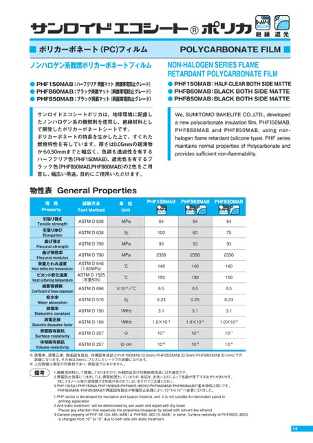 14■ポリカーボネート(PC)フィルムノンハロゲン系難燃ポリカーボネートフィルム●PHF150MAB:ハーフクリア両面マット(両面帯電防止グレード)●PHF860MAB:ブラック両面マット(両面電防止グレード)●PHF850MAB:ブラック両面マット(両面帯電防止グレード)サンロイドエコシートポリカは、地球環境に配慮したノンハロゲン系の難燃剤を使用し、絶縁材料として開発したポリカーボネートシートです。ポリカーボネートの特長を生かした上で、すぐれた燃焼特性を有しています。厚さは0.05mmの超薄物から0.50mmまでと幅広く、色調も透過性を有するハーフクリア色(PHF150MAB)、遮光性を有するブラック色(PHF850MAB,PHF860MAB)の2色をご用意し、幅広い用途、目的にご使用いただけます。We,SUMITOMOBAKELITECO.,LTD.,developedanewpolycarbonateinsulationfilm,PHF150MAB,PHF860MABandPHF850MAB,usingnon-halogenflameretardant(siliconetype).PHFseriesmaintainsnormalpropertiesofPolycarbonateandprovidessufficientnon-flammability.NON-HALOGENSERIESFLAMERETARDANTPOLYCARBONATEFILM●PHF150MAB:HALF-CLEARBOTHSIDEMATTE●PHF860MAB:BLACKBOTHSIDEMATTE●PHF850MAB:BLACKBOTHSIDEMATTE物性表GeneralPropertiesPOLYCARBONATEFILM■