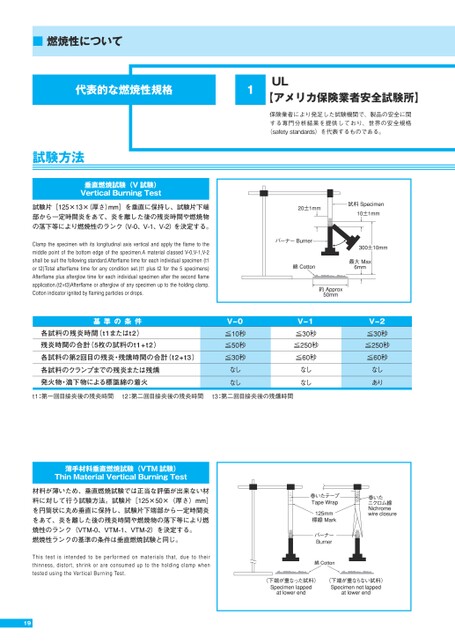 19■燃焼性について1UL【アメリカ保険業者安全試験所】保険業者により発足した試験機関で、製品の安全に関する専門分析結果を提供しており、世界の安全規格(safetystandards)を代表するものである。試験方法垂直燃焼試験(V試験)VerticalBurningTest薄手材料垂直燃焼試験(VTM試験)ThinMaterialVerticalBurningTest試験片[125×13×(厚さ)mm]を垂直に保持し、試験片下端部から一定時間炎をあて、炎を離した後の残炎時間や燃焼物の落下等により燃焼性のランク(V-0、V-1、V-2)を決定する。Burner材料が薄いため、垂直燃焼試験では正当な評価が出来ない材料に対して行う試験方法。試験片[125×50×(厚さ)mm]を円筒状に丸め垂直に保持し、試験片下端部から一定時間炎をあて、炎を離した後の残炎時間や燃焼物の落下等により燃焼性のランク(VTM-0、VTM-1、VTM-2)を決定する。燃焼性ランクの基準の条件は垂直燃焼試験と同じ。Clampthespecimenwithitslongitudinalaxisverticalandapplytheflametothemiddlepointofthebottomedgeofthespecimen.AmaterialclassedV-0,V-1,V-2shallbesuitthefollowingstandard.Afterflametimeforeachindividualspecimen(t1ort2)Totalafterflametimeforanyconditionset.(t1plust2forthe5specimens)Afterflameplusafterglowtimeforeachindividualspecimenafterthesecondflameapplication.(t2+t3)Afterflameorafterglowofanyspecimenuptotheholdingclamp.Cottonindicatorignitedbyflamingparticlesordrops.Thistestisintendedtobeperformedonmaterialsthat,duetotheirthinness,distort,shrinkorareconsumeduptotheholdingclampwhentestedusingtheVerticalBurningTest.代表的な燃焼性規格