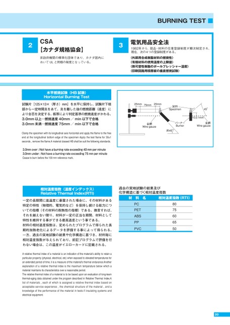 202CSA【カナダ規格協会】非政府機関の標準化団体であり、カナダ国内においてULと同様の制度となっている。3電気用品安全法〈外郭用合成樹脂材料の燃焼性〉〈有機材料の使用温度の上限値〉〈熱可塑性樹脂のボールプレッシャー温度〉〈印刷回路用積層板の垂直燃焼試験〉1982年から、部品・材料の任意登録制度が順次制定され、現在、次の4つの登録制度がある。水平燃焼試験(HB試験)HorizontalBurningTest試験片[125×13×(厚さ)mm]を水平に保持し、試験片下端部から一定時間炎をあて、炎を離した後の燃焼距離(速度)により合否を決定する。板厚により判定基準の燃焼速度がかわる。3.0mm以上…燃焼速度40mm/min以下で合格3.0mm未満…燃焼速度75mm/min以下で合格相対温度指数(温度インデックス)RelativeThermalIndex(RTI)一定の長期間に高温度に暴露された場合に、その材料がある特定の特性(物理的、電気的など)を保持し続ける能力についての指標(その材料の耐熱性の指標)である。換言すれば、それを越えない限り、材料が一定の正当な期間、材料として特性を維持する事ができる最高温度という事である。材料の相対温度指数は、定められたプログラムで得られた長期的加熱老化によるデータを評価する事によって得られる。一方、過去の実地試験の結果や化学構造に基づき、材料毎に相対温度指数が与えられており、前記プログラムで評価を行わない場合は、この温度がイエローカードに記載される。ClampthespecimenwithitslongitudinalaxishorizontalandapplytheflametothefreeendatthelongitudinalbottomedgeofthespecimenApplythetestflamefor30±1seconds,removetheflame.AmaterialclassedHBshallbesuitthefollowingstandards.3.0mmover:Nothaveaburningrateexceeding40mmperminute3.0mmunder:Nothaveaburningrateexceeding75mmperminuteCeasetoburnbeforethe100mmreferencemark.Arelativethermalindexofamaterialisanindicationofthematerial'sabilitytoretainaparticularproperty(physical,electrical,etc)whenexposedtoelevatedtemperaturesforanextendedperiodoftime.Iiisameasureofthematerial'sthermalendurance.Anotherexplanationofarelativethermalindexisthemaximumtemperaturebelowwhichamaterialmaintainsitscharacteristicsoverareasonableperiod.Therelativethermalindexofamaterialistobebaseduponanevaluationoflong-teamthermal-agingdataobtainedundertheprogramdescribedinRelativeThermalIndex.Alistofmaterials,eachofwhichisassignedarelativethermalindexbasedonacceptableserviceexperience,thechemicalstructureofthematerial,andaknowledgeoftheperformanceofthematerialintestsifinsulatingsystemsandelectricalequipment.BURNINGTEST■