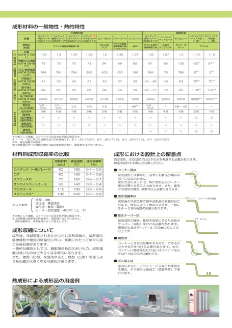 他のサ色調形状アンダイン使用適正後成形試型型製型モデル型製【材質成形長所短所耐用材質例【形状●既存(印●異種●成形●中央●内側●内側●絞り●型費成形材料の一般物性・熱的特性不透明材料透明材料品種カイダック一般グレード(1000タイプ)カイダック耐熱グレード(2000タイプ)カイダックフラットグレード(3000タイプ)NEWカイダックメタル調グレード(4000タイプ)ロア(ROA)スーパープレートタフエースRカイダック透明グレード(9000タイプ)サンロイドペットエースポリカエーススミペックス*キャスト板(一般)スミペックス*押出板(一般)樹脂名(材質)アクリル変性高衝撃塩ビ板PC/ABSアロイアクリル変性高衝撃塩ビ板(リサイクル)ABSアクリル変性高衝撃塩ビ板非晶性ポリエステルポリカーボネートアクリル【一般物性】試験項目(試験方法)(単位)比重ASTMD792(-)1.351.31.351.351.21.351.071.351.271.21.191.19荷重たわみ温度ASTMD648(℃)737870739469856768135100※197※1IZOD衝撃強度ASTMD256(J/m)引張強さ784784784200400400196784787842※22※2ASTMD638(MPa)曲げ強さ4139404142373842〜46496479※375※3ASTMD790(MPa)曲げ弾性率6863636869585868〜717393118※4118※4ASTMD790(MPa)22502150206022502100196019602450206023503200※43200※4【その他特性】燃焼性(UL94認定)5VAV-0〜6倍5VAV-0〜6倍V-0V-0V-0―HB※55VAV-0〜4倍―HB〜V2――成形倍率4倍5倍5倍3倍5倍4倍4倍2倍4倍耐候性(屋外暴露)(相対評価)×××××××××○◎◎耐薬品性(相対評価)○○○○△△△○△△△△透明性(相対評価)―――――――△○○◎◎※5特定品番のみ取得。※1〜4JISに準じた試験方法での代表値です。※1:JISK7207、※2:JISK7110、※3:JISK7113、※4:JISK7203*比較として掲載、スミペックスは住友化学㈱の製品です。表中の数値はすべて試験片厚さ3㎜の実測値であり、保証値ではございません。熱成形による成形品の用途例材料別成形収縮率の比較加熱秒数(sec)表面温度190180190180(℃)140240成形収縮率(%)ポリカエースタフエースRロアカイダック(一般グレード)サンロイドペットエーススミペックス*110708080651900.6〜0.80.6〜0.70.7〜0.80.4〜0.50.3〜0.40.5〜0.6成形における設計上の留意点真空成形、圧空成形では以下の点を考慮する必要があります。商品を設計する際にご注意ください。■コーナー部は部分が薄くなることもあります。また、雄型均一にはなりません。射出成形とは異なり、必ずしも製品の厚みは成形方法によっては、特に成形品のコーナーでの成形の場合、板厚R以上必要となります。■成形収縮率はります。材料によって異なりますが、一般に成形後の冷却工程で若干成形品の収縮がおこ0.4〜0.8%程度の収縮があります。■抜きテーパーは理想的な抜きテーパーは100㎜に対して2°テーパー(勾配)を付ける必要があります。雄型成形の場合、離型を容易にするため抜き以上です。■剛性はコーナーに剛性をもたせるにはコーナーを小け大きなRをつける必要があります。また、コーナーには応力が集中するので、できるださなRで結ぶのが効果的です。■ボス加工はる場合、ボス部分は後加工(接着剤等)で取接合にボルト・リベット・ビスなどを使用す付けます。0.4〜0.8%程度2°以上成形収縮についてまた、雌型(凹型)を使用すると、雄型(凸型)を使うよ度の高いものほど大きくなる傾向にあります。一般的な概念としては、線膨張係数の大きいもの、成形温こる後収縮があります。成形後、冷却固化されるときに生じる熱収縮と、成形品の延伸緩和や樹脂の結晶化に伴い、長期にわたって徐々に起りも収縮が大きくなる可能性があります。テスト条件成形型:雌型(箱状)板厚:3㎜成形法:真空成形ヒーター設定温度:400℃(上、下)※上記数値は測定値の代表例で、保証値ではございません。*比較として掲載、スミペックスは住友化学㈱の製品です。成形収縮率は、成形条件によって変化します。⎧⎨⎩透明ブラ