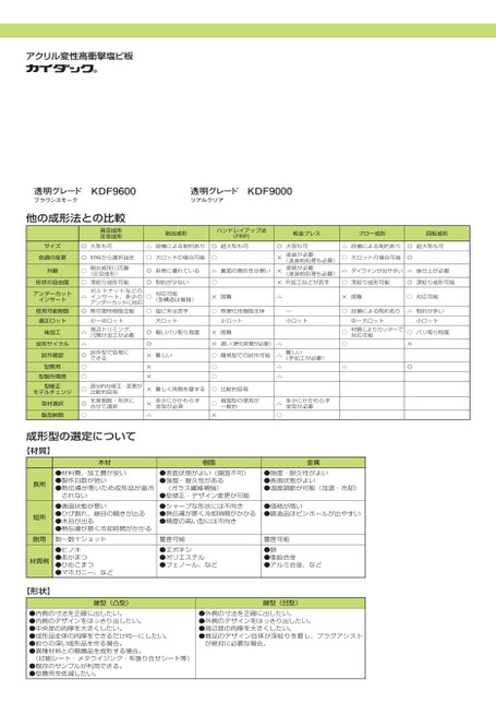 ※本※こ※本他の成形法との比較真空成形圧空成形射出成形ハンドレイアップ法(FRP)板金プレスブロー成形回転成形サイズ◎大型も可△設備による制約あり◎超大型も可◎大型も可塗装が必要△設備による制約あり◎超大型も可色調の変更◎材料から選択自在○大ロットの場合可能○✕(塗装前処理も必要)○大ロットの場合可能◎外観○射出成形に匹敵(圧空成形)◎非常に優れている△裏面の意匠性は悪い✕塗装が必要(塗装前処理も必要)△ダイラインが出やすい△後仕上が必要形状の自由度○アンダーカットに対応インサート、多少のボルトナットなどの深絞り成形可能熱可塑性樹脂全般◎制約が少ない○✕R加工などが苦手○深絞り成形可能◎深絞り成形可能アンダーカットインサート△○対応可能(型構造は複雑)✕困難△✕困難○対応可能使用可能樹脂◎○塩ビ系は苦手○熱硬化性樹脂主体―○設備による制約あり△制約が多い適正ロット周辺トリミング、小〜中ロット穴開け加工が必要大ロット小ロット小ロット材質によりカッターで中〜大ロット対応可能小ロット後加工△◎軽いバリ取り程度✕困難○○バリ取り程度成形サイクル△◎✕遅い(硬化時間が必要)△○✕試作確認◎できる試作型で容易に✕難しい○簡易型での試作可能△難しい(手加工が必要)型費用○○✕✕○○△△△◎型製作期間型修正モデルチェンジ○生産個数・形状に部分的な修正・変更が比較的容易合せて選択✕難しく時間を要する○比較的容易型材選択◎✕多少にかかわらず金型が必須○樹脂型の使用が一般的△多少にかかわらず金型が必要製品納期○△✕○【材質】成形型の選定について木材樹脂金属長所●製作日数が短い●材料費、加工費が安い●熱伝導が悪いため成形品が急冷されない●精度の高い型には不向き●シャープな形状には不向き●型修正・デザイン変更が可能(ガラス繊維補強)●強度・耐久性がある●表面状態がよい(鏡面不可)●熱伝導が悪く冷却時間がかかる●表面状態がよい●強度・耐久性がよい●温度調節が可能(加温・冷却)短所●ひめこまつ●ヒノキ数〜数十ショット●熱伝導が悪く冷却時間がかかる●木目が出る●表面状態が悪い●ひび割れ、継目の開きが出る●あかまつ●マホガニー、など●価格が高い●鋳造品はピンホールが出やすい耐用●フェノール、など●エポキシ量産可能●ポリエステル●アルミ合金、など●鉄量産可能●亜鉛合金材質例【形状】雄型(凸型)雌型(凹型)●既存のサンプルが利用できる。(印刷シート・メタライジング・布張り合せシート等)●異種材料との積層品を成形する場合。●成形品全体の肉厚をできるだけ均一にしたい。●中央部の肉厚を大きくしたい。●内側のデザインをはっきり出したい。●内側の寸法を正確に出したい。●絞りの深い成形品を作る場合。●型費用を低減したい。●周辺部の肉厚を大きくしたい。●外側のデザインをはっきり出したい。●外側の寸法を正確に出したい。●商品のデザイン自体が深絞りを要し、プラグアシストが絶対に必要な場合。透明グレードKDF9600ブラウンスモーク透明グレードKDF9000リアルクリア