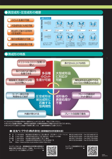 真空成形・圧空成形の概要射出成形〔産業機能性材料営業本部〕射出成形※本カタログ記載の用途は、本製品の当該用途への適用を無条件で保証するものではございません。※このカタログの内容は予告なく変更することがございます。予めご了承ください。※本カタログでご紹介した用途への使用に際しては、工業所有権等もご注意ください。製品に関するお問い合わせ・ご意見、カットサンプルカイダックはじめ、産業機能性材料営業本部取扱の➡(A5サイズ)のご依頼はコチラまで札幌名古屋東京大阪Web〒061-3242北海道石狩市新港中央2丁目763番地7号〒465-0024名古屋市名東区本郷3丁目71番地〒140-0002東京都品川区東品川2丁目5番8号(天王洲パークサイドビル)〒541-0041大阪市中央区北浜4丁目7番28号(住友ビル2号館)https://www.sumibe.co.jp/product/plate/index.html☎(052)726-8555Fax052)726-8362☎(03)5462-8700Fax03)5462-8710☎(06)6232-5284Fax06)6232-5308☎(0133)64-6680Fax0133)60-2388〔産業機能性材料営業本部〕カイダック技術資料のDLはコチラまで➡E0006J2210-2210