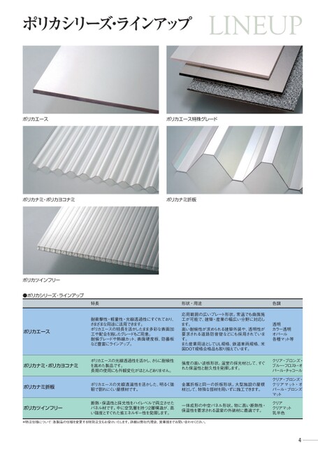 4LINEUPポリカシリーズ・ラインアップポリカエースポリカナミ・ポリカヨコナミポリカツインフリー●ポリカシリーズ・ラインアップ特長形状・用途色調ポリカエース耐衝撃性・軽量性・光線透過性にすぐれており、さまざまな用途に活用できます。ポリカエースの特長を活かしたまま多彩な表面加工や配合を施したグレードもご用意。耐候グレードや熱線カット、表面硬度板、防曇板など豊富にラインアップ。応用範囲の広いプレート形状。常温でも曲面施工が可能で、建築・産業の幅広い分野に対応します。高い耐候性が求められる建築外装や、透明性が要求される道路防音壁などにも採用されています。また産業用途としてUL規格、鉄道車両規格、米国DOT規格合格品も取り揃えています。透明カラー透明オパール各種マット等ポリカナミ・ポリカヨコナミポリカエースの光線透過性を活かし、さらに耐候性を高めた製品です。長期の使用にも外観変化がほとんどありません。強度の高い波板形状。温室の採光材として、すぐれた保温性と耐久性を発揮します。クリア・ブロンズ・ブルー・フロスト・オパール・チャコールポリカナミ折板ポリカエースの光線透過性を活かした、明るく強靭で割れにくい屋根材です。金属折板と同一の折板形状。大型施設の屋根材として、特殊な部材を用いずに施工できます。クリア・ブロンズ・クリアマット・オパール・ブロンズマットポリカツインフリー断熱・保温性と採光性をハイレベルで両立させたパネル材です。中に空気層を持つ2層構造が、高い強度とすぐれた省エネルギー性を発揮します。一体成形の中空パネル形状。特に高い断熱性・保温性を要求される温室の外装材に最適です。クリアクリアマット乳半色*特注仕様について:各製品の仕様を変更する特別注文もお受けいたします。詳細は弊社代理店、営業部までお問い合わせください。ポリカエース特殊グレードポリカナミ折板