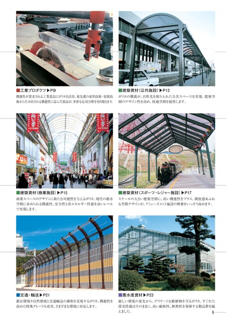 6■工業プロダクツ▶P9機能性が要求される工業部品にポリカを活用。最先端の成形技術・切削技術から生み出される機能性に富んだ部品が、多彩な応用分野を切り開きます。■建築資材(商業施設)▶P15商業スペースのデザインに新たな可能性を与えるポリカ。現代の都市空間に求められる機能性、安全性と省エネルギー性能を高いレベルで実現します。■交通・輸送▶P21都市環境や自然環境と交通輸送の調和を実現するポリカ。機能性を高めた特殊グレードも充実、さまざまな環境に対応します。■建築資材(公共施設)▶P13ポリカの機能が、自然光を取り入れた公共スペースを実現。建築空間のデザイン性を高め、快適空間を提供します。■建築資材(スポーツ・レジャー施設)▶P17スケールの大きい建築空間に、高い機能性をプラス。開放感あふれる空間デザインが、アミューズメント施設の興奮をいっそう高めます。■農水産資材▶P23厳しい環境の変化から、デリケートな動植物を守るポリカ。すぐれた採光性能はそのままに、高い耐候性、断熱性を発揮する製品群を揃えました。