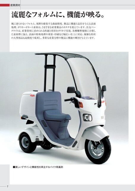 7産業資材流麗なフォルムに、機能が映る。■美しいデザインと機能性を両立するバイク用風防風に逆らわないフォルム。視野を確保する曲面精度。製品に機能と品位を与える表面処理。ポリカーボネート素材は、さまざまな産業製品のカタチを変えています。住友ベークライトは、産業資材に求められる性能と形状をポリカで実現。各種難燃規格に合格した素材群に加え、表面の特殊処理や塗装・印刷など幅広い仕上に対応。複雑な形状の大型部品も高精度で成形し、多彩な産業分野の製品に機能の輝きを与えています。