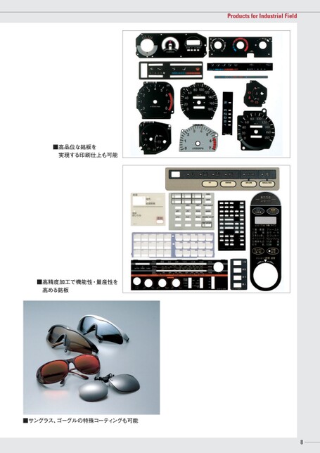 8ProductsforIndustrialField■サングラス、ゴーグルの特殊コーティングも可能■高品位な銘板を実現する印刷仕上も可能■高精度加工で機能性・量産性を高める銘板