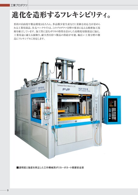 9工業プロダクツ進化を造形するフレキシビリティ。形状の自由度や製品精度はもちろん、多品種少量生産などに柔軟な対応力が求められる工業用部品。住友ベークライトは、このプロダクツ分野の要求に応える精密加工技術を確立しています。加工性に富むポリカの特性を活かした高精度切削部品に加え、工業用途に耐える強靭さ、耐久性を持つ製品の供給が可能。幅広い工業分野の製品にフレキシブルに対応します。■透明度と強度を両立した工作機械用ポリカーボネート積層安全窓