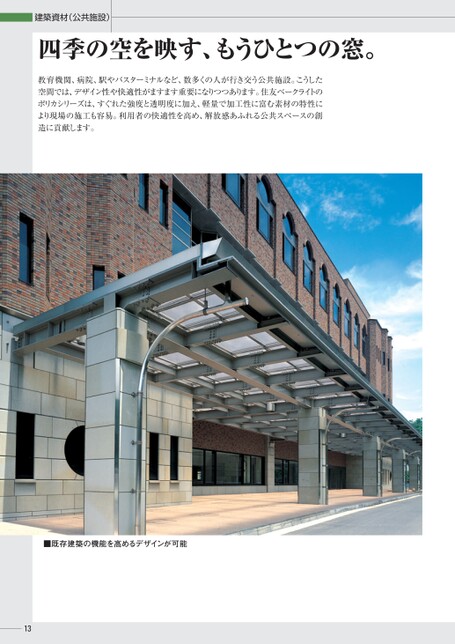 13建築資材(公共施設)四季の空を映す、もうひとつの窓。教育機関、病院、駅やバスターミナルなど、数多くの人が行き交う公共施設。こうした空間では、デザイン性や快適性がますます重要になりつつあります。住友ベークライトのポリカシリーズは、すぐれた強度と透明度に加え、軽量で加工性に富む素材の特性により現場の施工も容易。利用者の快適性を高め、解放感あふれる公共スペースの創造に貢献します。■既存建築の機能を高めるデザインが可能