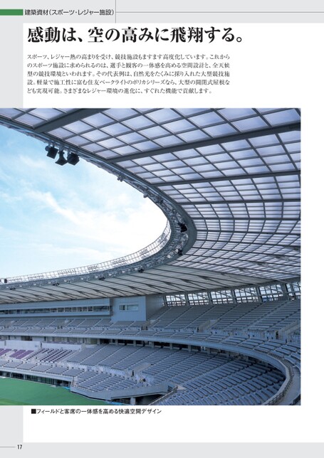 17建築資材(スポーツ・レジャー施設)感動は、空の高みに飛翔する。スポーツ、レジャー熱の高まりを受け、競技施設もますます高度化しています。これからのスポーツ施設に求められるのは、選手と観客の一体感を高める空間設計と、全天候型の競技環境といわれます。その代表例は、自然光をたくみに採り入れた大型競技施設。軽量で施工性に富む住友ベークライトのポリカシリーズなら、大型の開閉式屋根なども実現可能。さまざまなレジャー環境の進化に、すぐれた機能で貢献します。■フィールドと客席の一体感を高める快適空間デザイン