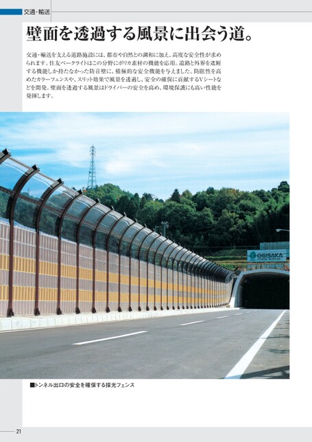 21交通・輸送壁面を透過する風景に出会う道。交通・輸送を支える道路施設には、都市や自然との調和に加え、高度な安全性が求められます。住友ベークライトはこの分野にポリカ素材の機能を応用。道路と外界を遮断する機能しか持たなかった防音壁に、積極的な安全機能を与えました。防眩性を高めたカラーフェンスや、スリット効果で風景を透過し、安全の確保に貢献するVシートなどを開発。壁面を透過する風景はドライバーの安全を高め、環境保護にも高い性能を発揮します。■トンネル出口の安全を確保する採光フェンス