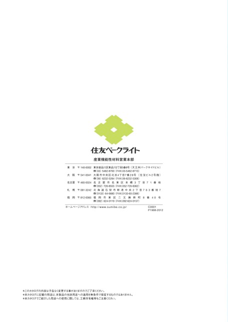 1東京〒140-0002東京都品川区東品川2丁目5番8号(天王州パークサイドビル)☎(03)5462-8700(FAX.03-5462-8710)大阪〒541-0041大阪市中央区北浜4丁目7番28号(住友ビル2号館)☎(06)6232-5284(FAX.06-6232-5308)名古屋〒465-0024名古屋市名東区本郷3丁目71番地☎(052)726-8555(FAX.052-726-8362)札幌〒061-3242北海道石狩市新港中央2丁目763番地7☎(0133)64-6680(FAX.0133-60-2388)福岡〒812-0065福岡市東区二又瀬新町8番40号☎(092)624-0119(FAX.092-624-0157)産業機能性材料営業本部ホームページアドレスhttp:www.sumibe.co.jpC0001P1908-2012*このカタログの内容は予告なく変更する事がありますのでご了承ください。*本カタログに記載の用途は、本製品の当該用途への適用を無条件で保証するものではありません。*本カタログでご紹介した用途への使用に際しては、工業所有権等もご注意ください。
