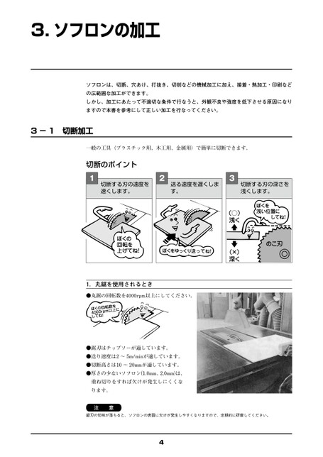 3.ソフロンの加工ソフロンは、切断、穴あけ、打抜き、切削などの機械加工に加え、接着・熱加工・印刷などの広範囲な加工ができます。しかし、加工にあたって不適切な条件で行なうと、外観不良や強度を低下させる原因になりますので本書を参考にして正しい加工を行なってください。3-1切断加工一般の工具(プラスチック用、木工用、金属用)で簡単に切断できます。切断のポイント1切断する刃の速度を速くします。2送る速度を遅くします。3切断する刃の深さを浅くします。1ぼくの回転を上げてね!(○)浅くぼくを浅い位置にしてね!11ぼくをゆっくり送ってね!(×)深くのこ刃1.丸鋸を使用されるとき●丸鋸の回転数を4000rpm以上にしてください。ぼくの回転数を4000rpm以上にしてね!●鋸刃はチップソーが適しています。●送り速度は2~5m/minが適しています。●切断高さは10~20mmが適しています。●厚さの少ないソフロン(1.0mm、2.0mm)は、重ね切りをすれば欠けが発生しにくくなります。注意鋸刃の切味が落ちると、ソフロンの表面に欠けが発生しやすくなりますので、定期的に研摩してください。4