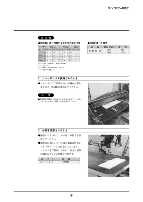 3.ソフロンの加工具体例●回転数と送り速度による欠けの発生状況●使用に適した鋸刃品名オリオンTC+20鋸径(mm)255305歯数80100回転数厚さ送りスピード14.Om/分9.7m/分5.4m/分3.4m/分4500rpm2735rpm4500rpm1.02.03.010.01.02.03.010.01.0×10S×××××△△○△△○○○○○○×××××××××△△○△△○○○○○○チップソー:歯数80、直径255mm○……欠けなし△……微小(0.5mm以下)の欠け×……欠けが目立つ2.シャーリングを使用されるとき●シャーリングで切断すると切断面が荒れますので、粗切断に使用してください。注意●寒冷時の切断は、割れることがありますので、ソフロンを20℃~30℃に暖めてから切断してください。3.糸鋸を使用されるとき●融着しやすいので、やや粗目の鋸刃を使用してください。●融着防止用に、当社では糸鋸融着防止シート「ローバン」を用意しております。ローバンをご使用になれば、鋸刃の種類に関係なく良好な切断が可能です。品名ローバンS品番KS9105